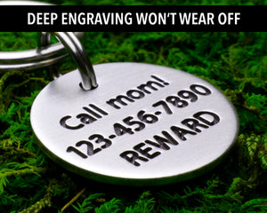 Help your furry friend get home safely with a custom dog tag! This personalized pet ID tag for dogs & cats is deeply engraved using our specially developed technique, ensuring your information will still be readable when it matters most.